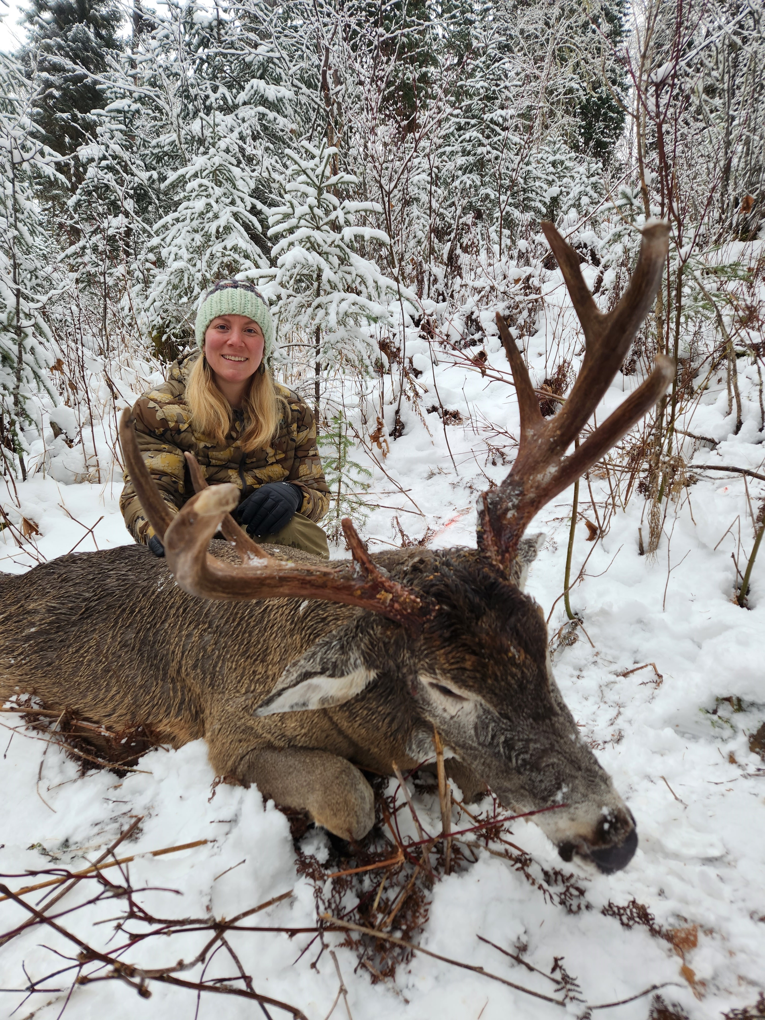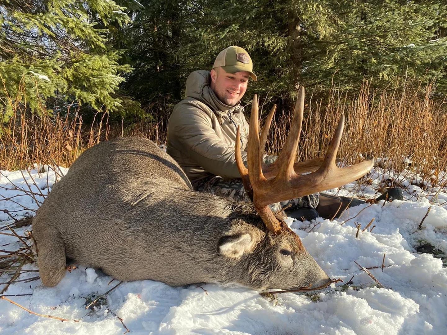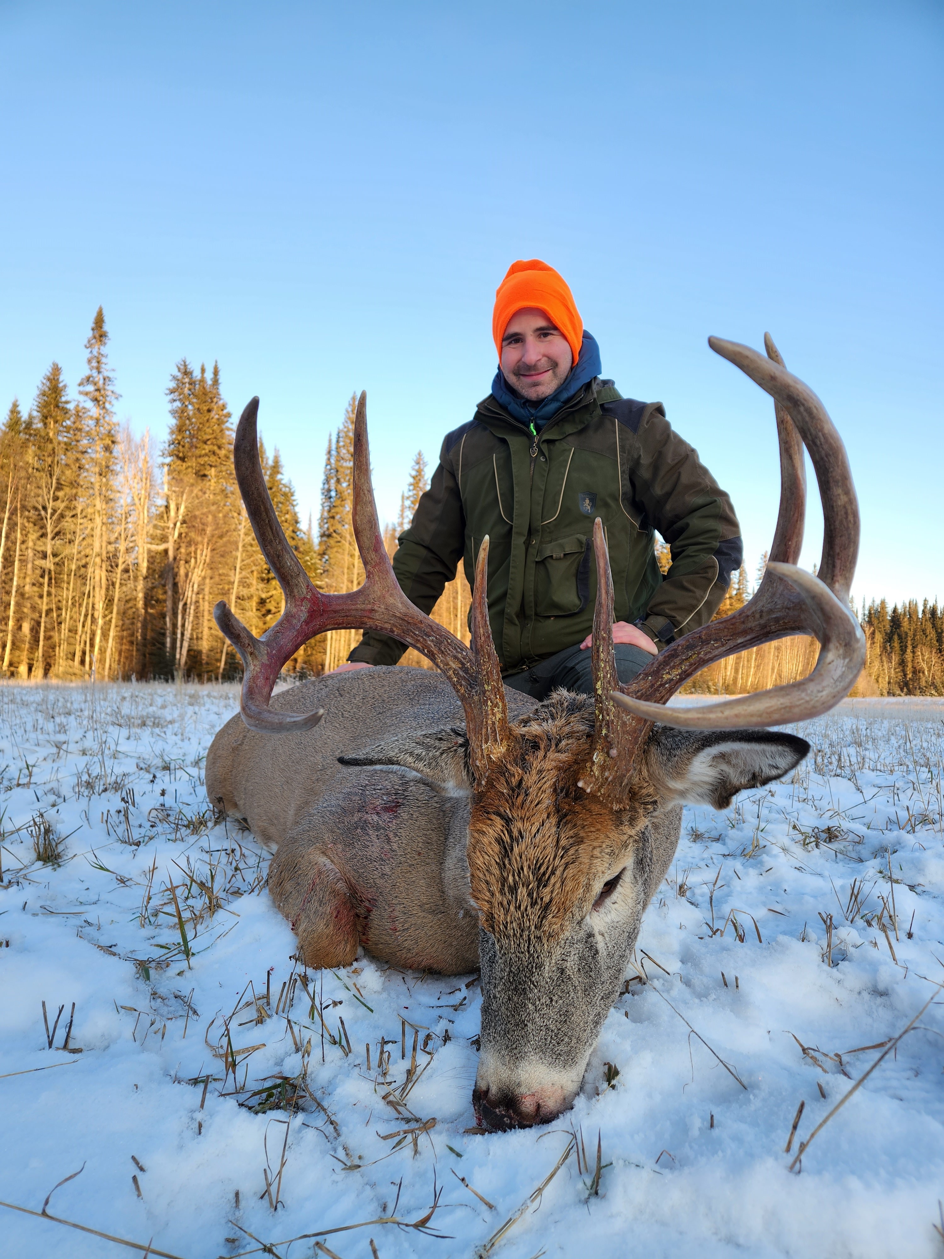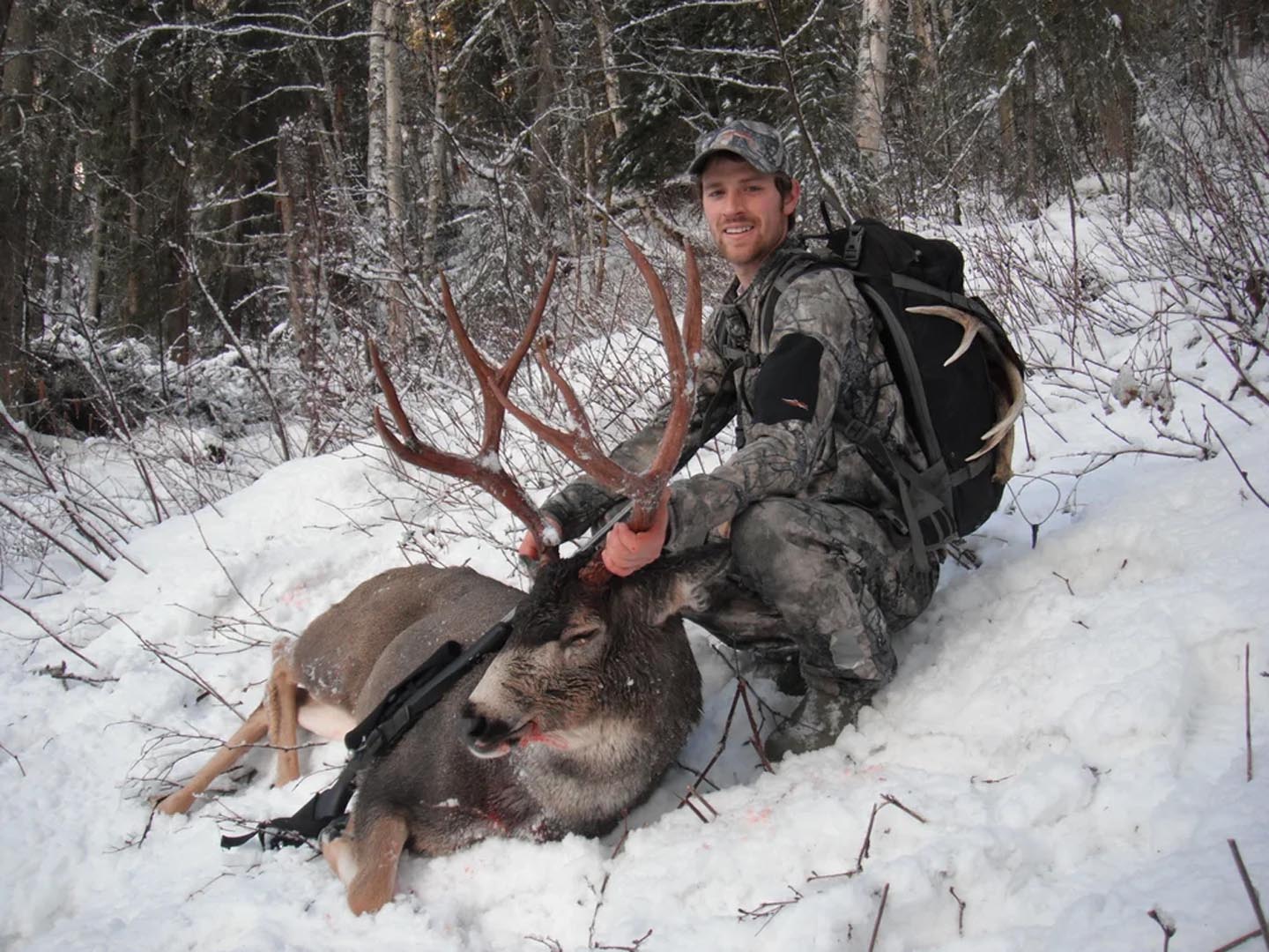 As the snow starts to fall in November the Mule Deer and Whitetail rut gets into full swing and both species can be hunted successfully at the same time. All the Mule Deer that live at high elevation during the summer and early fall are forced into the winter rage this time of year which is the year round home of the Whitetail. This hunt is based out of the cabin camp and is suitable for all hunters regardless of age or any physical limitations. Moose also share the same winter range and can be added on a trophy fee basis.